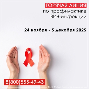 Федеральная служба по надзору в сфере защиты прав потребителей и благополучия человека в период с 24 ноября по 05 декабря 2025 г. проводит тематическую «горячую линию» по профилактике ВИЧ-инфекции, посвященной Всемирному Дню борьбы со СПИДом.